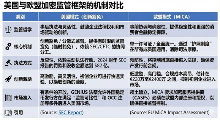 美国监管的转向,也是在参与一场全球监管竞赛。其“创新豁免”代表的弹性、分类监管模式,与欧盟《加密资产市场法案》(MiCA)代表的统一、事前授权模式形成鲜明对比。