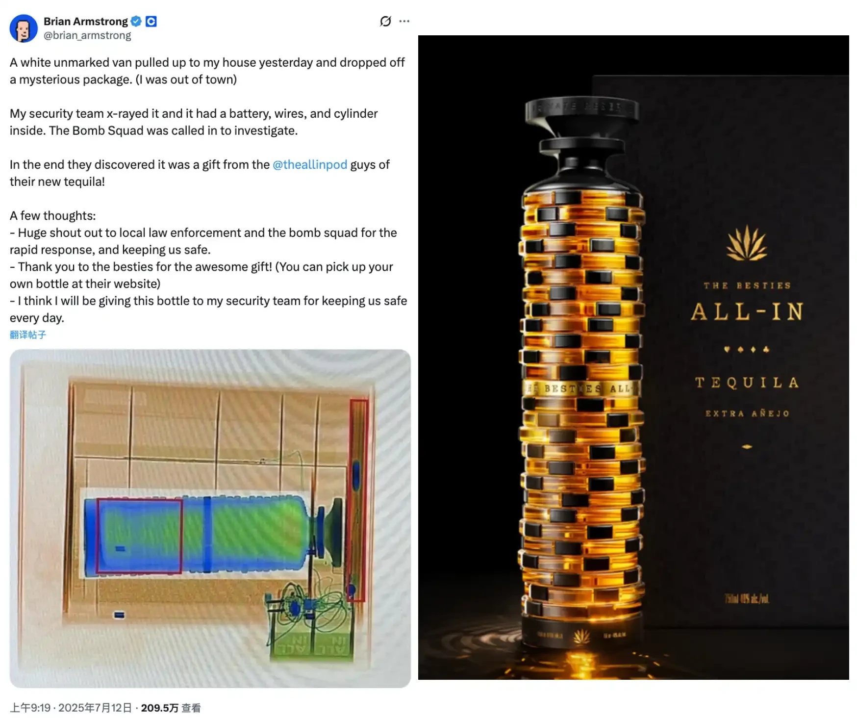 经过仔细检查后真相大白:包裹内装的是The All-In Podcast( theallinpod)播客节目组赠送的龙舌兰酒礼盒,X光片上显示的电池和电线实际上是为酒瓶发光装置的设计。