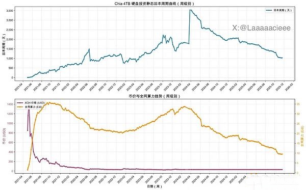 ● 2021 年 5 月,Chia 曾引发全球硬盘断货。当时 XCH 币价飙升至 $1,600,早期的硬盘投入显示的静态回本周期一度被压缩至 130 天以内。 这种极致的暴利瞬间引发了全球存储算力的海啸。然而,随之而来的是惨烈的“剪刀差”: 尽管币价下跌,但前期订购的硬盘持续上线,全网算力在币价见顶后依然惯性暴涨,回本周期从 30 天被迅速拉长至 3,000 天以上。