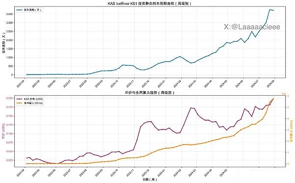 ● 观察 IceRiver KS1 矿机的数据,在 2023 年中旬,其回本周期一度低至 150 天。 与 Chia 不同的是,KAS 的币价甚至保持了上涨趋势。但即便如此,矿工依然亏损,因为算力增长的斜率远超币价上涨的斜率。工业级 ASIC 的快速迭代和大规模部署,让全网难度呈指数级上升。 尽管币价坚挺,但由于难度暴涨,KS1 这款机器的回本周期依然不可逆转地飙升至 3,500 天。