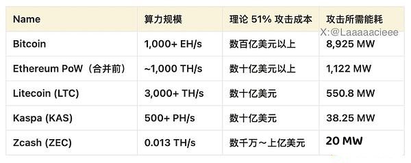 从整个网络的算力规模看,Zcash 的安全基座显得极其薄弱,已经进入众多曾被成功 51% 攻击的小型 PoW 链的风险区间。