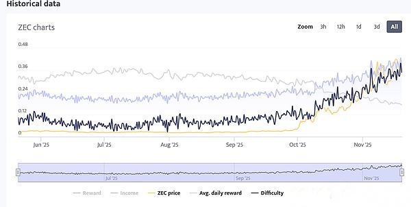 过去两个月,ZEC 的高收益正在快速吸引算力进场,全网 hashrate 开始显著增长, difficulty 也已经进入升高周期。从图表可以清楚看到,ZEC 的 price(黄色线)在 9 月底开始脱离横盘状态,而 hashrate(淡紫色)与 difficulty(深蓝色)随之出现同步抬升。这一段走势意味着挖矿端已经开始对价格上涨做出反应。