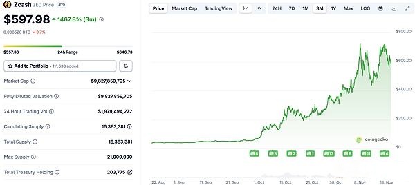 在过去短短两个月内,Zcash($ZEC)成为整个加密市场最耀眼的焦点。从 9 月底的 $50 暴涨至近期高点 $730,涨幅高达 1460%,FDV 更是飙升至 8 年以来的历史峰值 $13B。