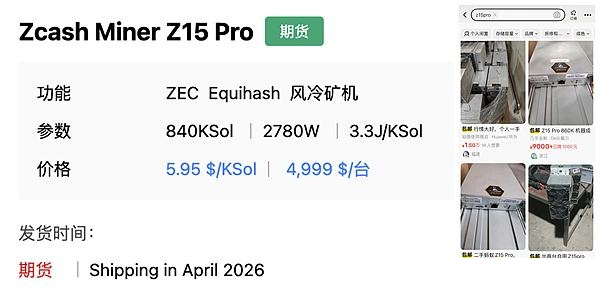 根据网络最新数据,ZEC 的全网算力约为 12.48 GSol/s,按一台 Z15 Pro 算力 0.00084 GSol/s 计算,仅需要约 14,857 台 Z15 Pro 矿机,对应的能源消耗大约在 40 MW 级别,这相当于一个中小型比特币矿场的规模。