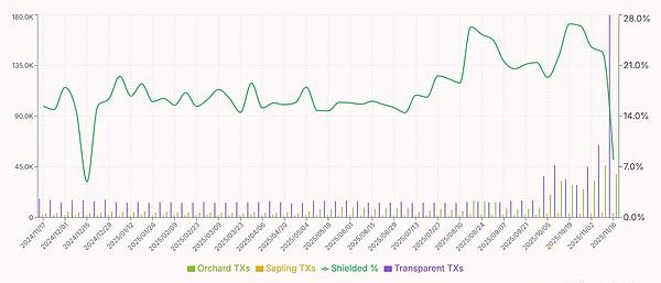 ● 作为隐私链, 绝大部分交易仍是透明交易,shielded 交易不足 10%