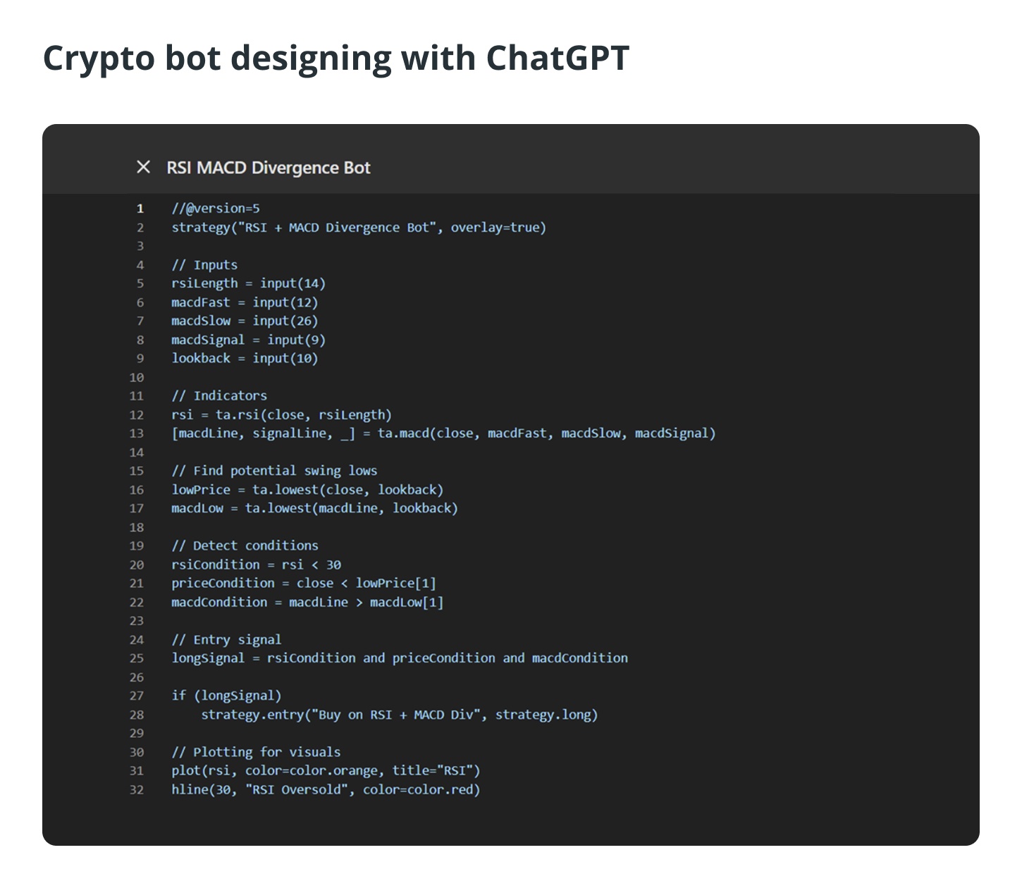 举例来说,当要求ChatGPT设计一个仅在RSI降至30以下且MACD指标显示背离时触发交易的机器人时,它不仅生成了完整的Pine Script代码逻辑,还专业地建议添加成交量过滤条件以减少虚假信号。