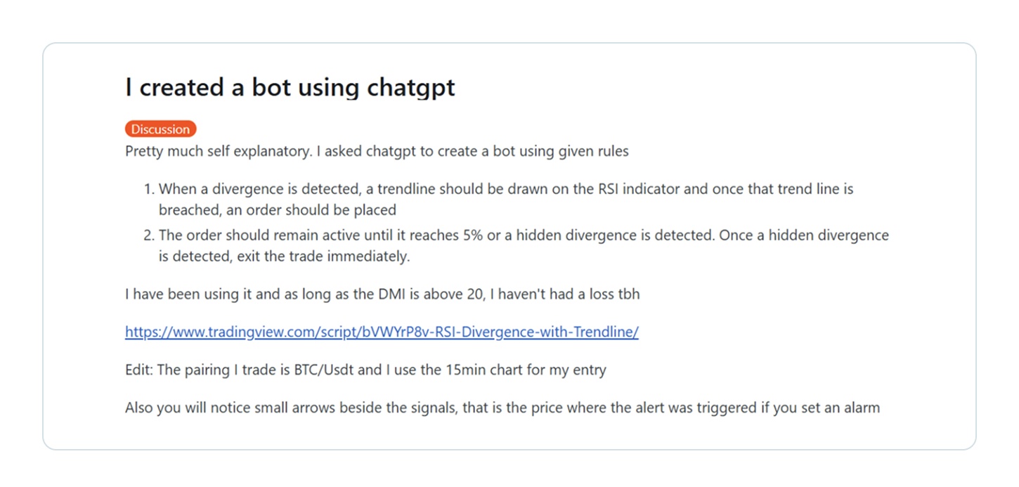 上图展示了一位用户请求ChatGPT创建加密货币交易机器人的实例。该机器人设计为在相对强弱指标(RSI)背离趋势线被突破时进场,并在出现隐藏背离或实现5%利润时自动退出,专注于BTC/USDT 15分钟时间周期图表,且要求方向动量指标(DMI)高于20。DMI是一种重要的技术分析指标,主要用于判断资产是否处于明确趋势中及其趋势强度。