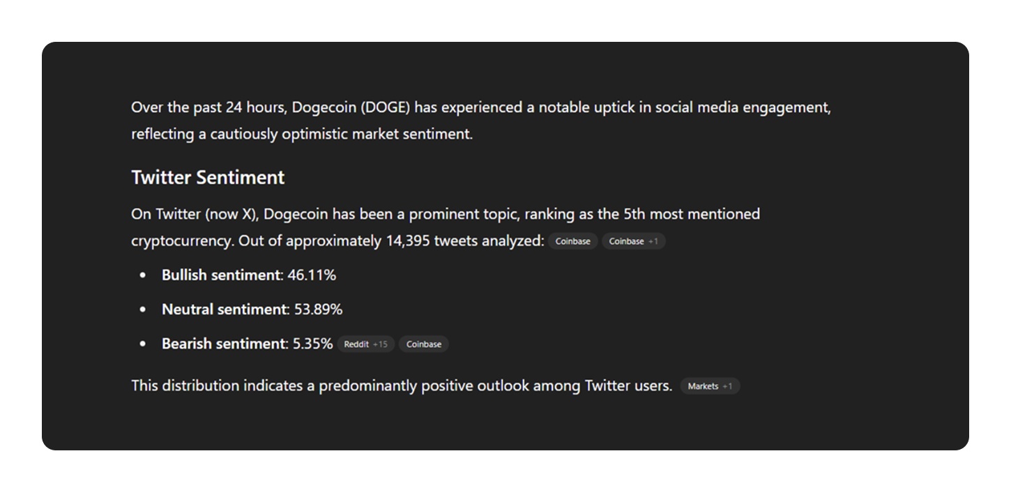 ● "基于过去24小时的X平台帖子和Reddit评论,分析DOGE的市场情绪状态。"