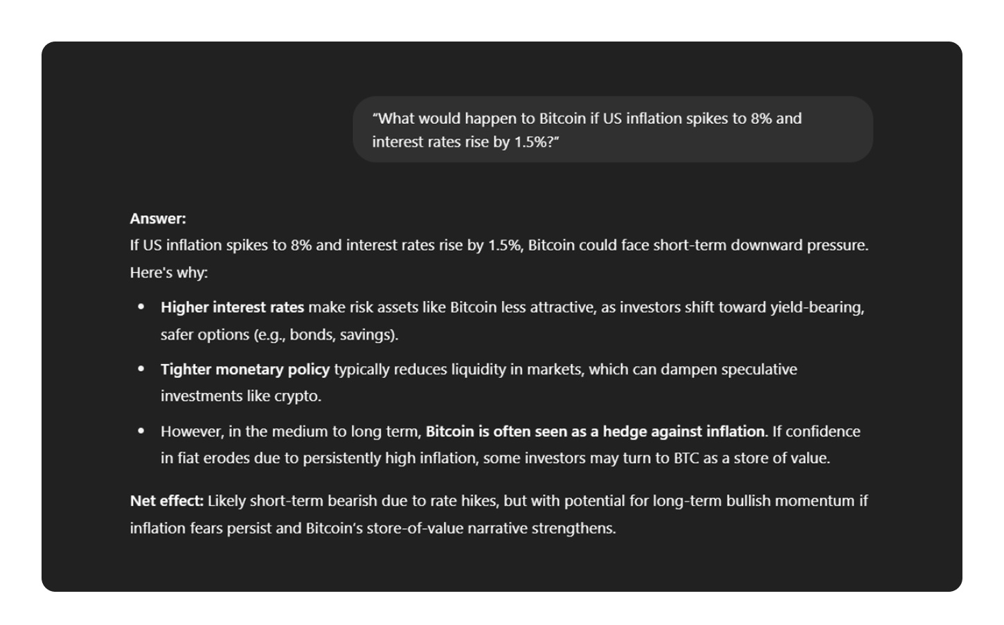 ChatGPT对此问题回应指出,如果美国通胀飙升至8%且利率上升1.5%,比特币 (BTC) 可能面临短期看跌压力,这主要由于流动性减少,但从长期来看,比特币可能因被视为通胀对冲工具而增强吸引力。