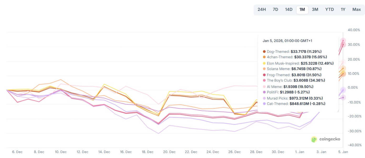 「政治金融币」、「AI Memecoin」等新兴类别,也已占据了数十亿美元的市场规模,这一趋势表明,Memecoin板块正形成自身的内部轮动规律。