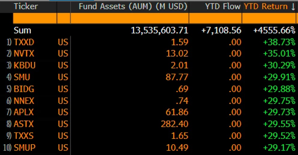 彭博情报ETF分析师Eric Balchunas指出,开年表现最佳的部分基金产品,正是杠杆型Memecoin ETF。