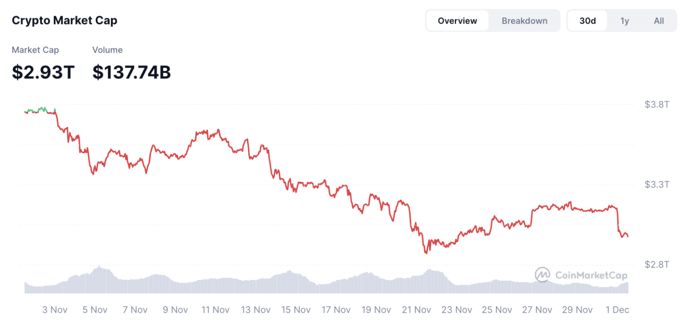 以太坊(ETH)交易价约2,833美元,过去30日跌幅约27%;Solana(SOL)徘徊在127美元附近,30日跌幅约32%,在三者中回调最为剧烈;XRP维持在2.03美元左右,同期下跌约19%。