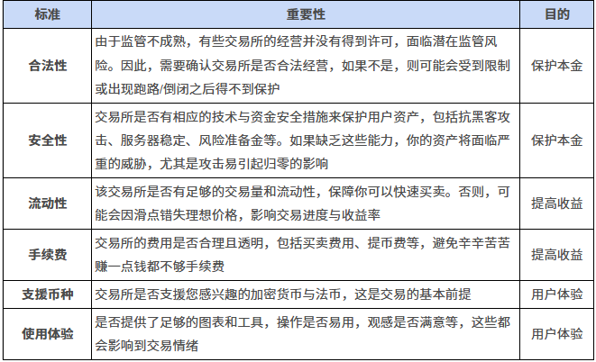 考虑合法性与安全性问题,旨在降低亏损的可能性,保证本金安全,这是关键与前提,因为没有本金就不用考虑其他问题。流动性与手续费,意在降低费用,提高交易手续费。当然,这一点比较有限,要想大幅度提高收益率,主要取决于个人的交易能力。此外,界面友好与币种数量,解决的是用户体验问题,也是用户比较在意的标准。