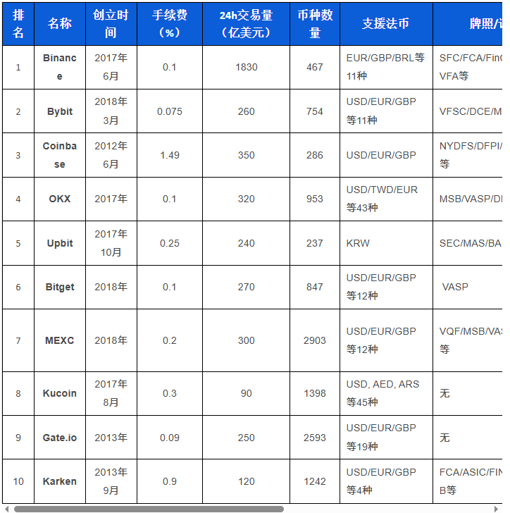 十大交易所的排名;注:手续费一般是根据用户的等级动态变化,上述的数据是平均值