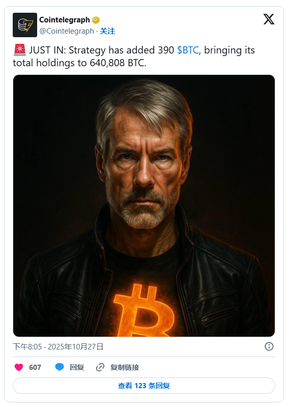 Michael Saylor昨天在X上分享了Strategy的投资组合,并标注今天是橙点日。有趣的是,该公司的最新购买并未依赖于出售自己的MSTR股份。根据美国证券交易委员会的文件,策略公司反而通过出售其他股份类别,STRF、STRK和STRD,筹集资金,产生了4470万美元的流动资金。这标志着在本月初至今的连续第三周进行购买。如之前报导,策略在10月20日至26日之间增加了168个比特币,花费1880万美元。该公司的股票表现也保持强势,根据TradingView数据,MSTR上涨了近2%,交易接近289美元。此期间比特币持续上涨,达到了116,000美元。现在连续3天处于上涨状态。