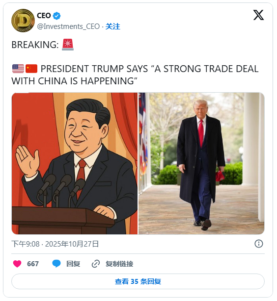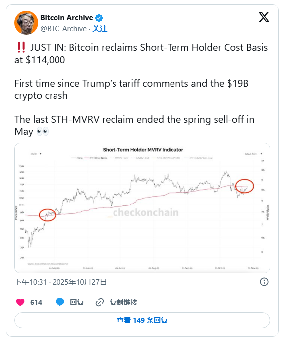 比特币价格在川普与习近平会晤的环境中稳步回升。历史上其价格对于美中贸易关系反应强烈,当贸易战情况有所改善时,会出现一系列的上涨热潮。随着两国重新讨论关税,市场预期缓解贸易紧张局势,将能促进全球流动性和风险偏好。如果10月30日的贸易谈判宣布关税减免,比特币价格的结构将获得理想的宏观刺激。