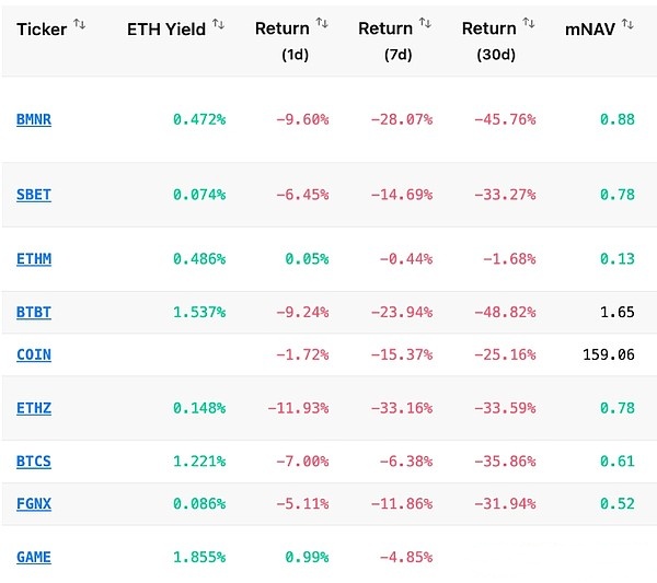 随着以太坊跌破3000美元,其他的ETH财库公司也陷入困局。据Capriole Investments的数据显示,这些公司持有的ETH资产收益率为负25%至48%。如下图所示,排名前十的DAT公司在周线和日线时间框架内均出现亏损。
