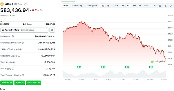 2025年11月21日,比特币跌至8.34万美元,以太坊跌破2800美元,加密总市值下探至3万亿美元以下,现报2.97万亿美元,24小时跌幅8.7%。