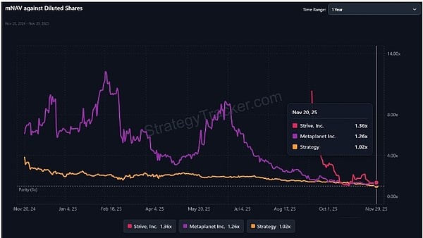 Capriole Investments的数据还显示,这些公司中的大多数的市值与净资产值之比(mNAV)(用于评估数字资产库估值的指标)已跌破1,表明其融资能力受损。