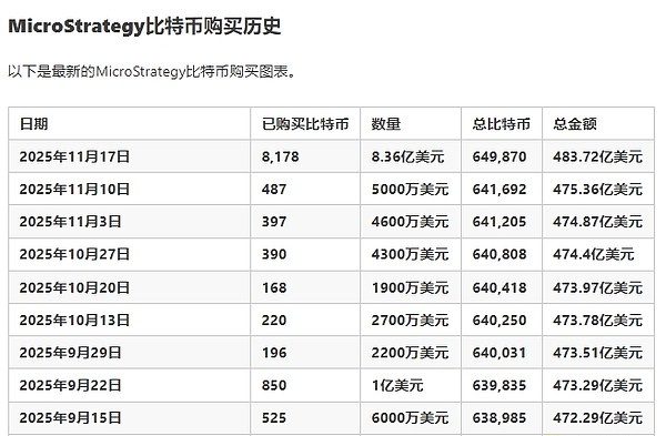 Strategy在11月17日继续买入8178枚BTC,使其总持有BTC数量上升至649870枚。