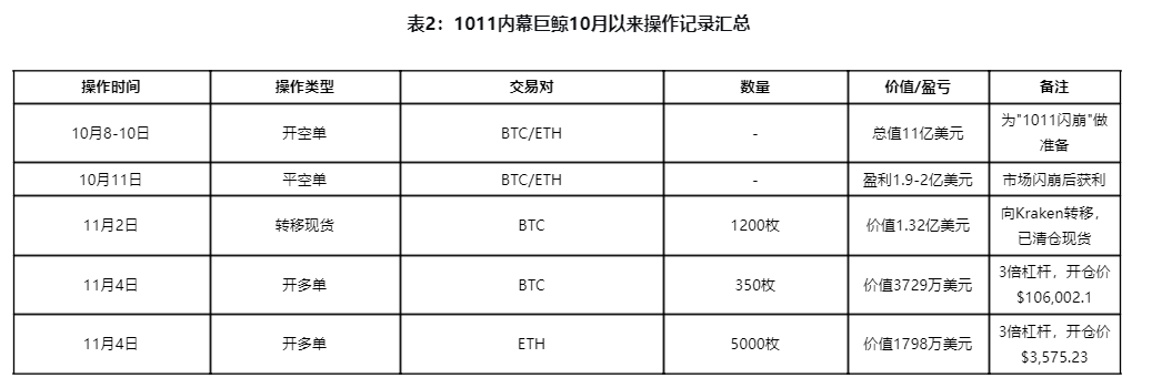 ● 1011内幕巨鲸得名于其在10月11日的精准操作。在闪崩发生前,该巨鲸开立了总值11亿美元的BTC和ETH空单,随后在市场暴跌中单日盈利估计达1.9亿至2亿美元。11月2日,其向Kraken转移1200枚BTC(价值1.32亿美元),完成了现货获利了结。