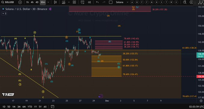 对于反弹尝试,下一步需关注价格在阻力位附近的表现。More Crypto Online指出若能突破142.60美元,将是动能复苏的早期信号。该水平既是前B浪高点,也是关键结构边界。