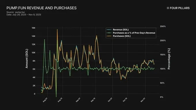 ● Pump.fun是领先的迷因币交易平台,产生了约11亿美元的累计费用。其回购计划已购买约83万枚SOL(约1.65亿美元),相当于其(推测出的)流通价值的10.3%。