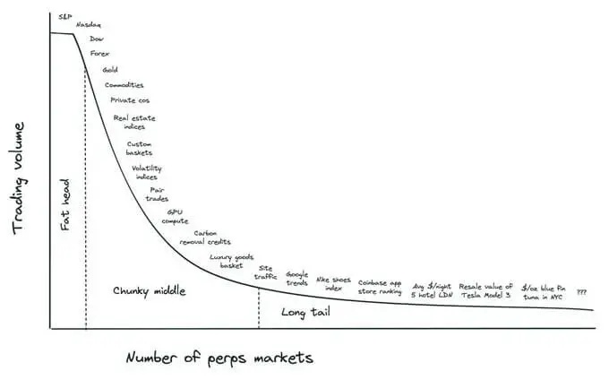 正如Ventuals创始人Alvin Hsia所描述的,“肥头(Fat Head)”由传统金融已经覆盖的资产类别组成(指数产品、外汇、大宗商品);“厚中段(Chunky Middle)”包括筹得股权、现实世界数据集和大宗商品指数;而“长尾(Long Tail)”则延伸到利基信号,如局部房地产价格、产品溢价或文化趋势指数。传统金融无法轻易将这些数据点商品化,但链上结算系统可以。HIP-3实际上开启了需求驱动的市场创建模式。