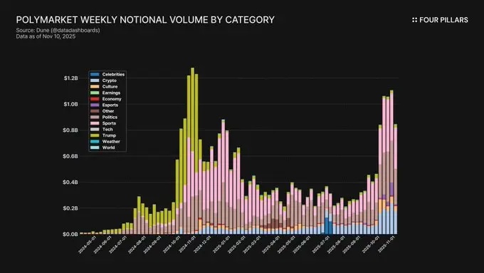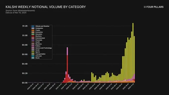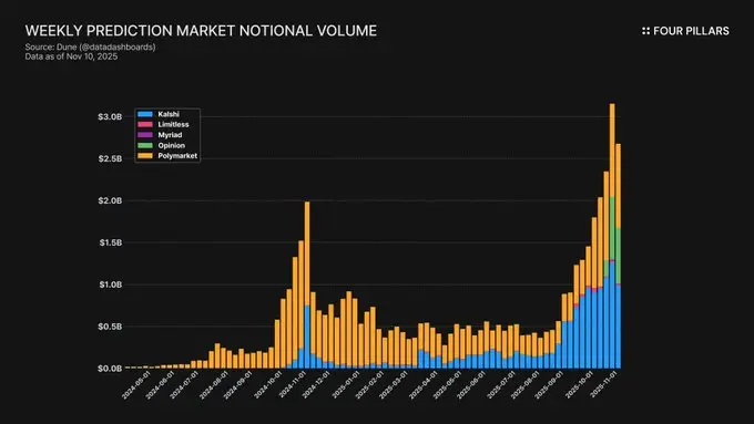 预测市场自2024年以来增长迅速:截至2025年10月,周名义成交额约为25亿美元,周交易次数超过800万次。Polymarket占据了70–75%的活动份额,而Kalshi在获得CFTC批准并扩展到体育和政治市场后,份额攀升至20%左右。