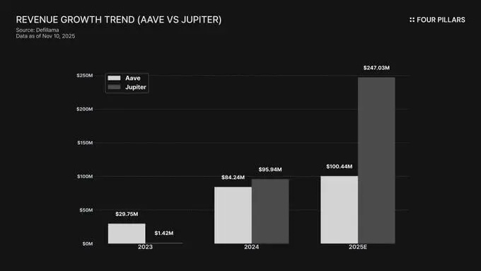 ● Aave(AAVE)和Jupiter(JUP)持续发布稳定且增长的现金流。Aave的年度收入从2023年的2975万美元增长到2025年的9939万美元。Jupiter的收入增长更为惊人,从2023年的142万美元飙升至2025年的2.46亿美元。