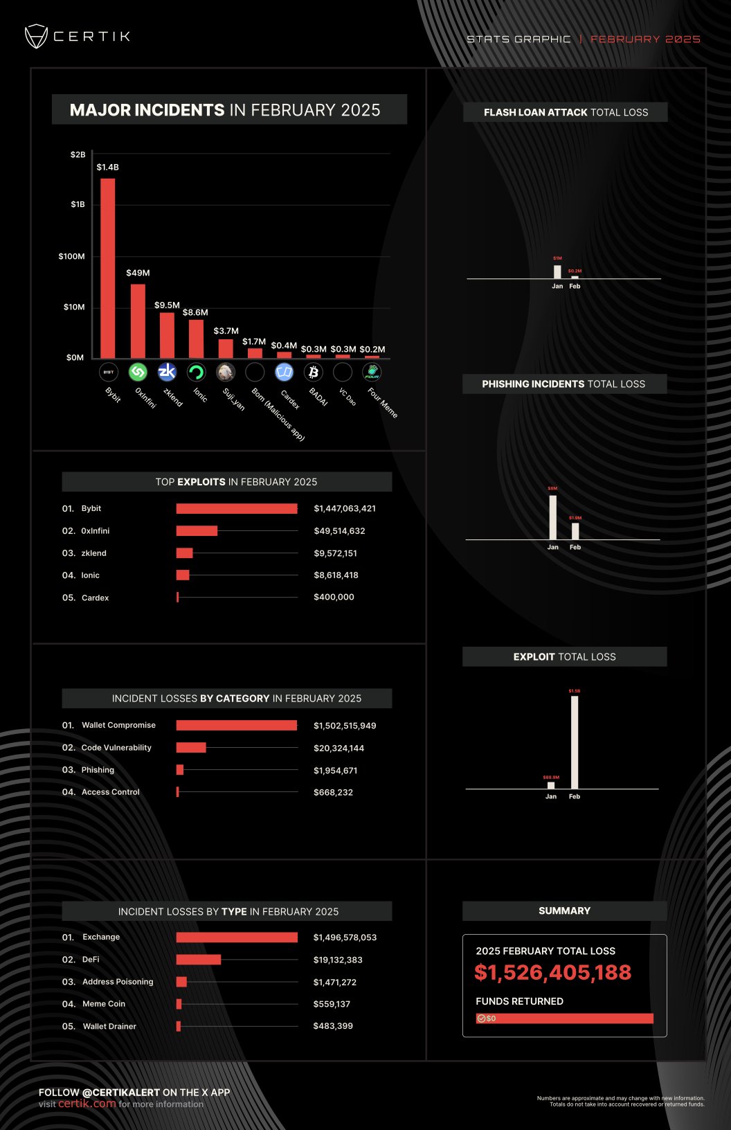 在所有已报告的事件中,2月份Bybit的安全漏洞事件最为严重。据CoinTelegraph和Business Insider报道,约有14亿美元的数字资产遭到泄露,使其成为有史以来规模最大的加密货币黑客攻击事件之一。