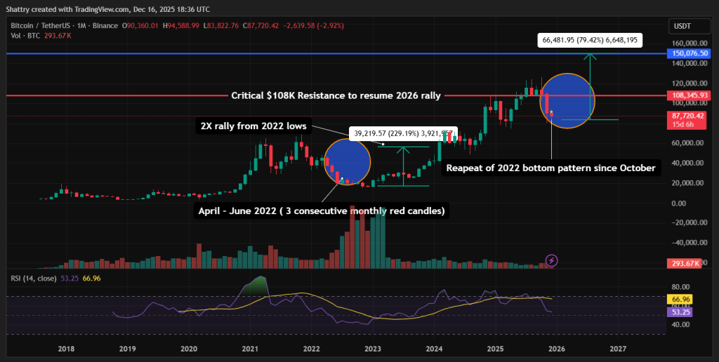 若月线强势收于108,000美元上方,行情很可能重新打开通道,推动2026年牛市行情,目标指向140,000至150,000美元区间。
