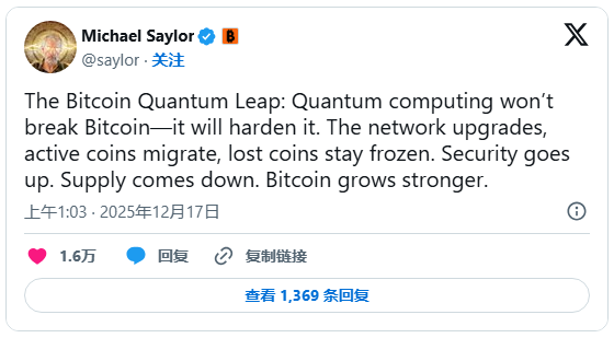 在12月16日发布于X平台的一则帖文中,Saylor解释称,一旦量子计算取得突破,比特币网络将进行升级,活跃中的比特币将完成迁移,而已经丢失的比特币则会继续被冻结。