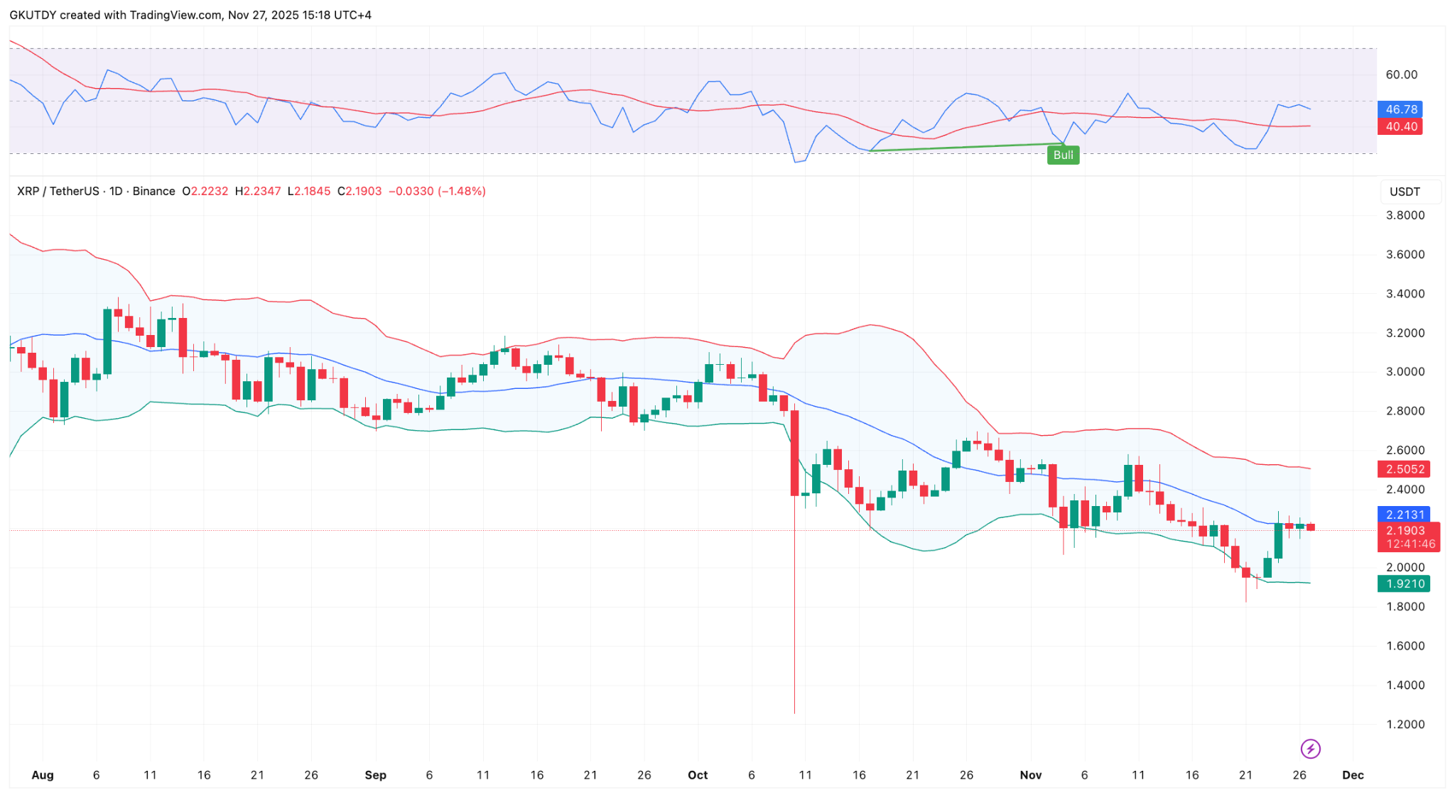 根据TradingView的数据,XRP近期价格有所下跌,在2.10美元至2.20美元之间波动。但真正的问题不在于K线图本身。它一直徘徊在布林带区间内,这种热门山寨币已经连续近两周被困在布林带中轨下方。这通常意味着价格下方正在积聚压力。