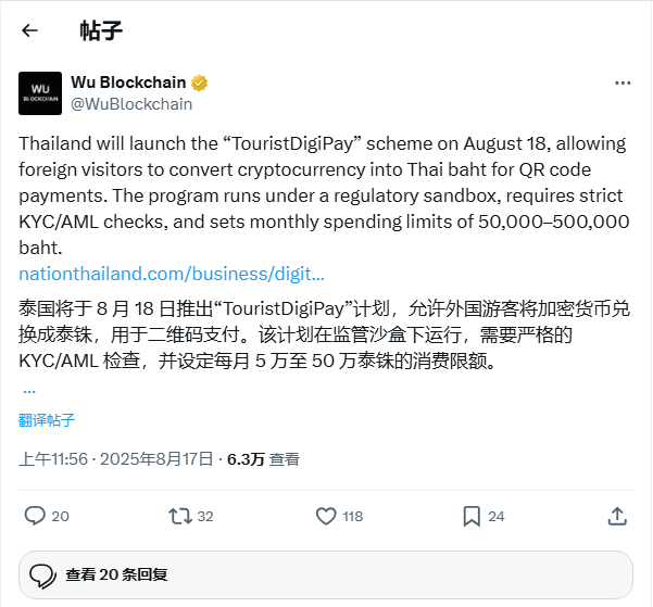 泰国于2025年8月18日星期一推出了“TouristDigiPay”计划,允许外国游客将加密货币兑换成泰铢,用于全国范围内的电子支付。