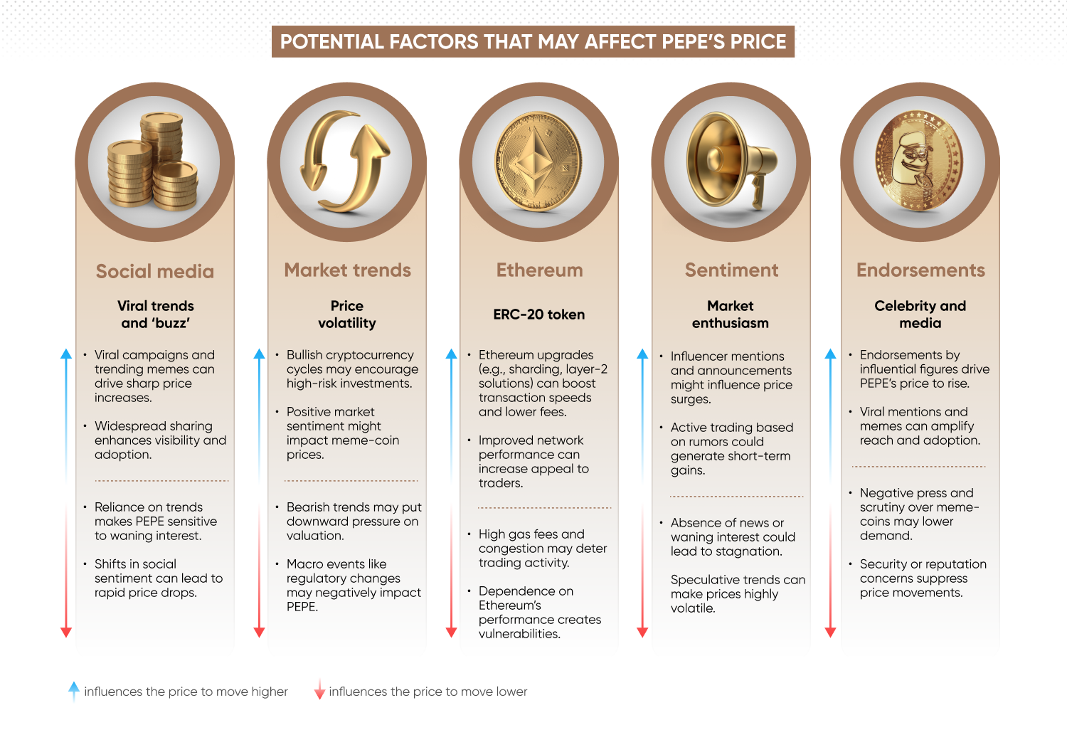 迷因币(例如 PEPE )在投机交易中快速发展。谣言、意见领袖的提及或意外公告都可能导致价格突然上涨或下跌。此外,缺乏新闻或投机兴趣减弱也会造成价格停滞不前。交易者必须对情绪和投机趋势的变化保持警惕,因为它们会极大地影响短期价格走势。