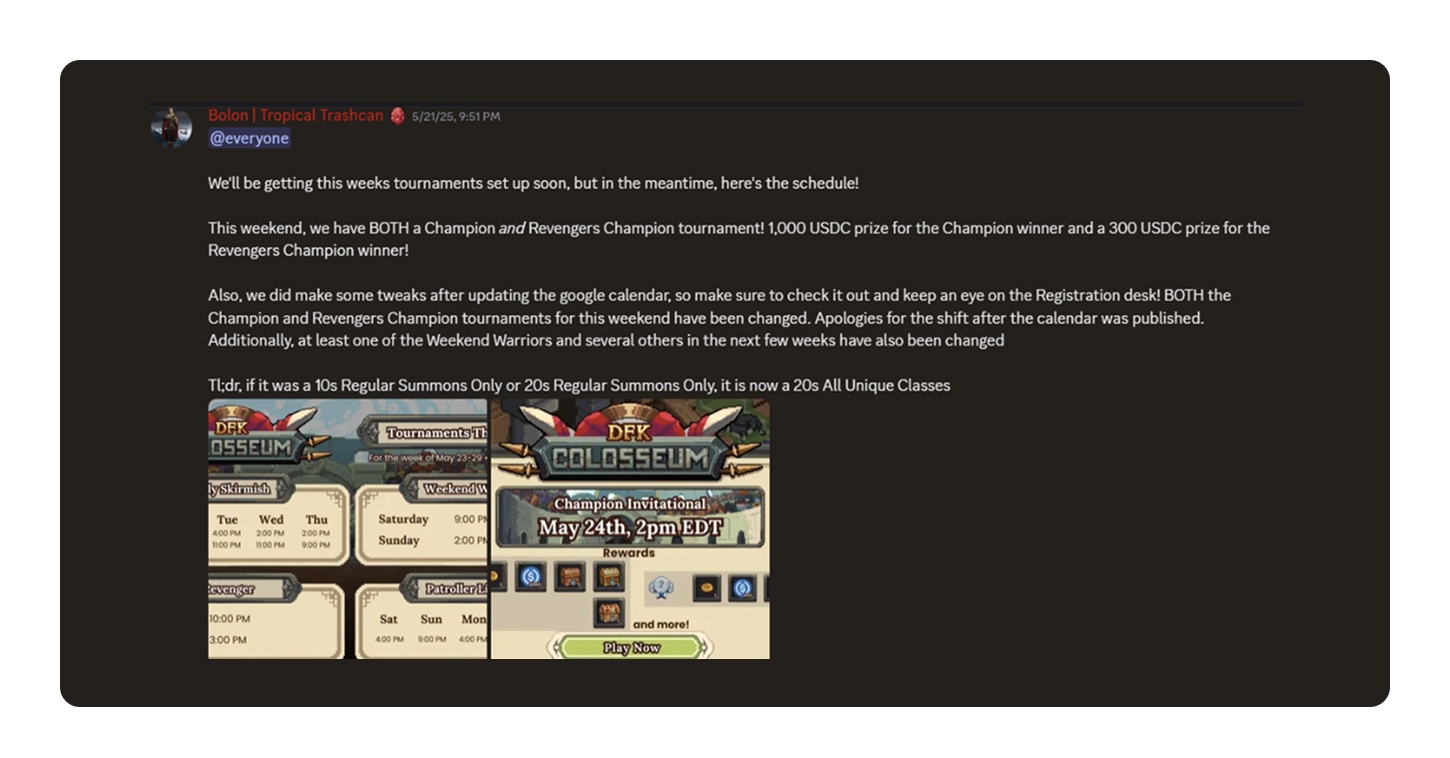 例如,DeFi Kingdoms的Discord展示了如上所示的变更日志和开发日志,显示定期更新和AMA回顾。社区成员继续测试新功能并提供直接反馈,这些反馈通常会反映在GitHub提交中。社区成员经常参与测试功能并向开发者提供直接反馈,强化了积极的构建优先文化。