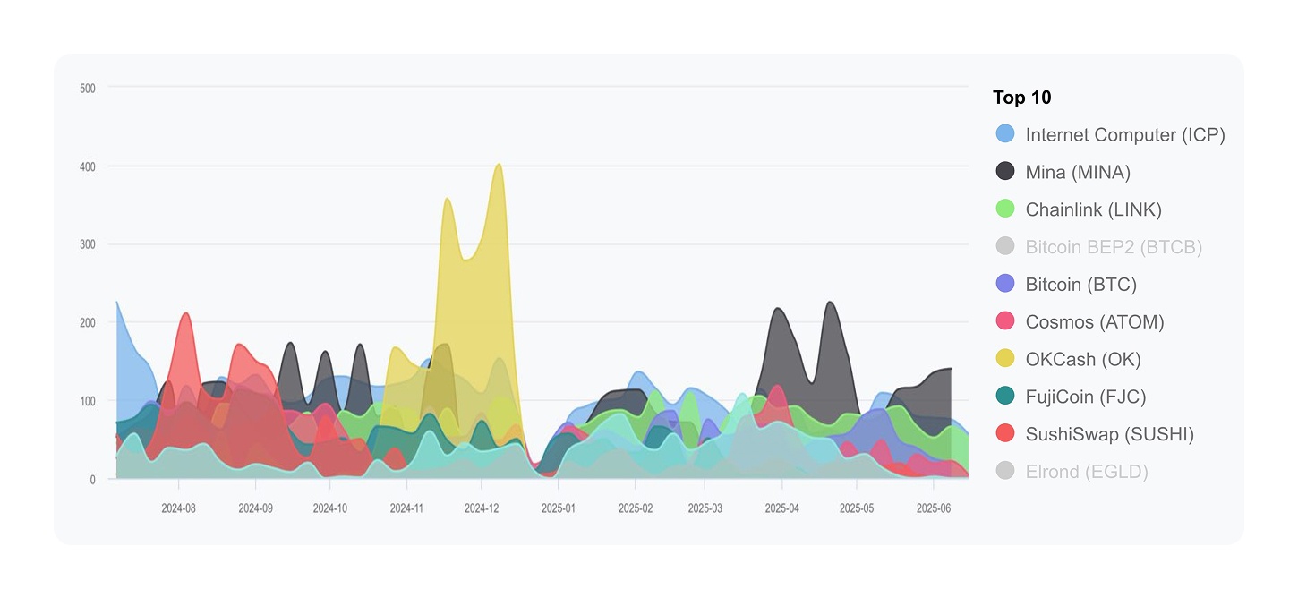 1、检查活跃的提交和贡献者:有定期提交活动的项目,尤其是来自多个贡献者的项目,往往有真实的开发支持。如果最后一次更新是在六个月前,且所有提交都来自一个开发者,那就是一个危险信号。截至2025年6月,Internet Computer (ICP)在CryptoMiso的GitHub提交中排名第一,跟踪到超过120名开发者的6000多次贡献。
