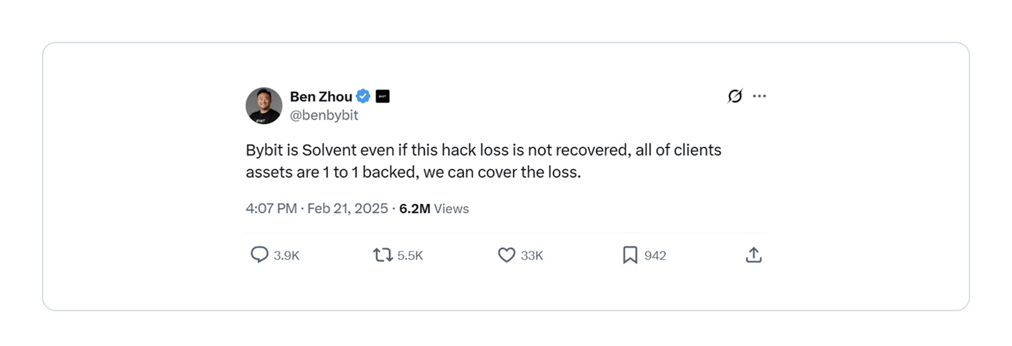 X让加密领导者实时回应危机,显示他们在压力下是否透明。BybitCEO Ben Zhou在30分钟内跳上X,确认了一个ETH冷钱包被盗(14亿美元被盗),向用户保证他们的资金是安全的,所有其他钱包都是安全的,并且Bybit完全有偿付能力。