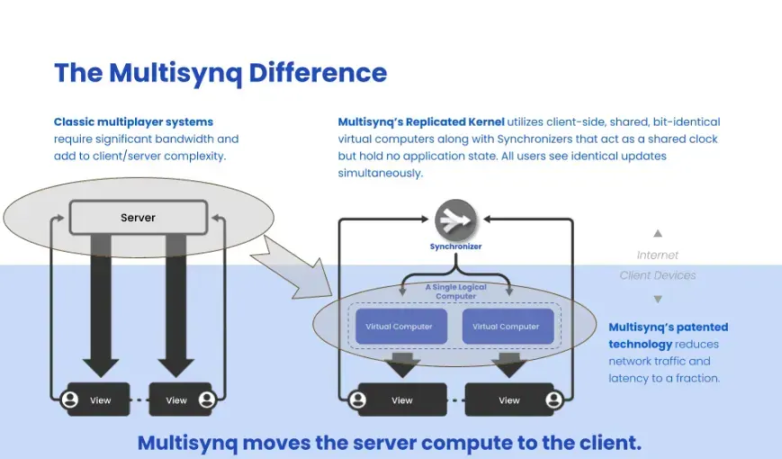 Multisynq 旨在为实时同步构建一种新的互联网协议。如今实时同步没有标准化的协议,因此像游戏服务器和视频会议工具这样的应用程序必须从头开始构建自己的解决方案。在中心化的客户端 - 服务器设置中,服务器处理所有计算,这造成了单点故障。