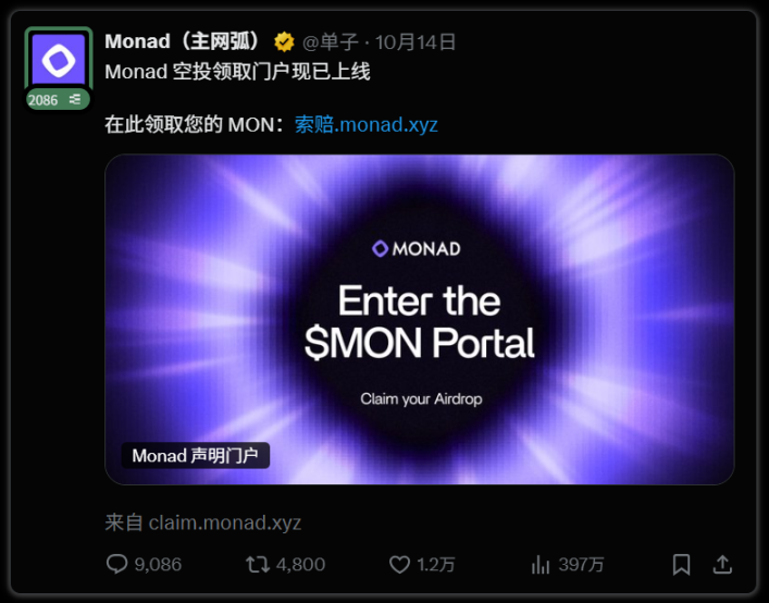 大家期待已久的时刻即将到来。Monad 已于 10 月 14 日正式宣布其空投申领门户,用户的兴奋情绪空前高涨。因为 Monad 早在 2023 年第一季度宣布其种子轮融资时就获得了巨大关注,但自那以后主网已经超过两年半没有上线。