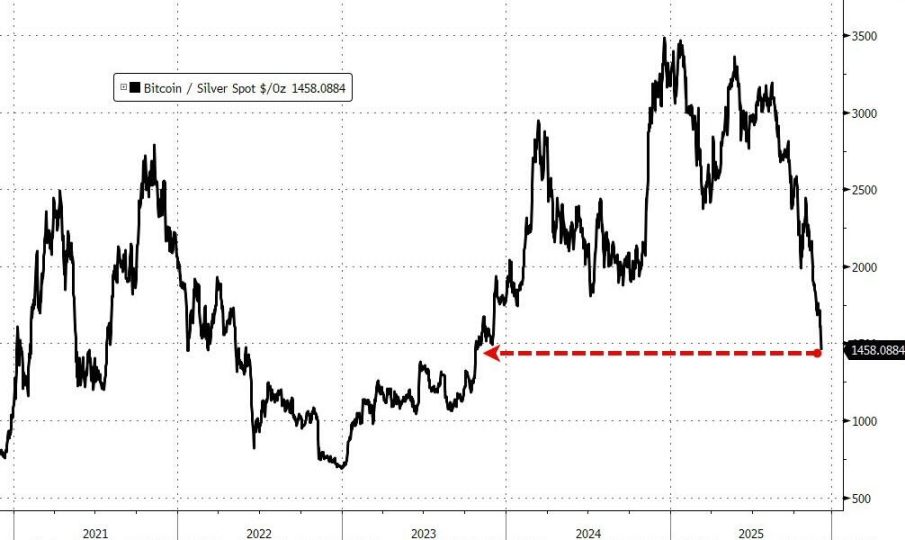 ● 比特币购买力缩水:在一年前,一枚比特币可以购买3500盎司白银;而如今,同一单位的比特币仅能购买1450盎司白银,创下自2023年10月以来的最低点。这一比率的大跌直观地反映了加密资产相对于传统避险资产(如白银)的疲软。
