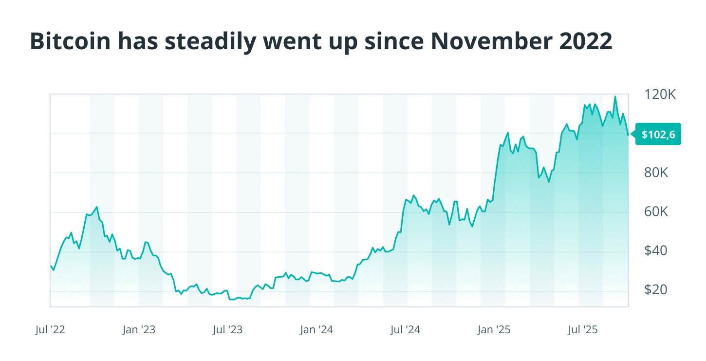 自2022年11月比特币价格约为16,000美元以来,其作为“数字黄金”的声誉显著提升。此后,其价格稳步上涨。