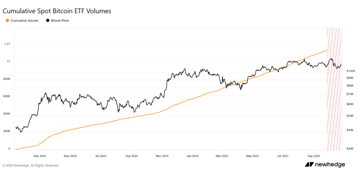 比特币现货 ETF 累计交易量。数据来源:Newhedge