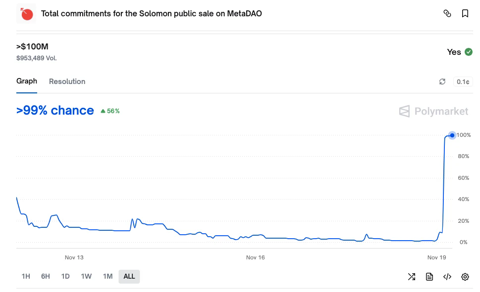 11月18日下午,距离募集结束不足12H时,Solomon仅募集了725万美元,因此有玩家笃定其无法在剩下的时间募集超4000万美元,所以纷纷在Polymarket上买入“no”,甚至有稳妥型玩家对“Solomon募集超过1亿美元”买入“no”,此结果概率在募集结束前3个小时还保持在97%左右。