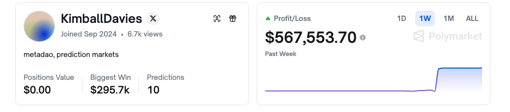 这名交易员名叫KimballDavies,2024年9月加入Polymarket,其slogan为“metadao,prediction markets”,可能代表着其专门玩metadao相关的预测事件。