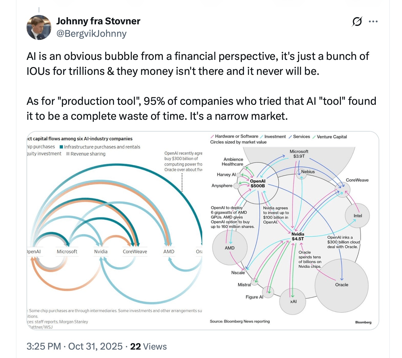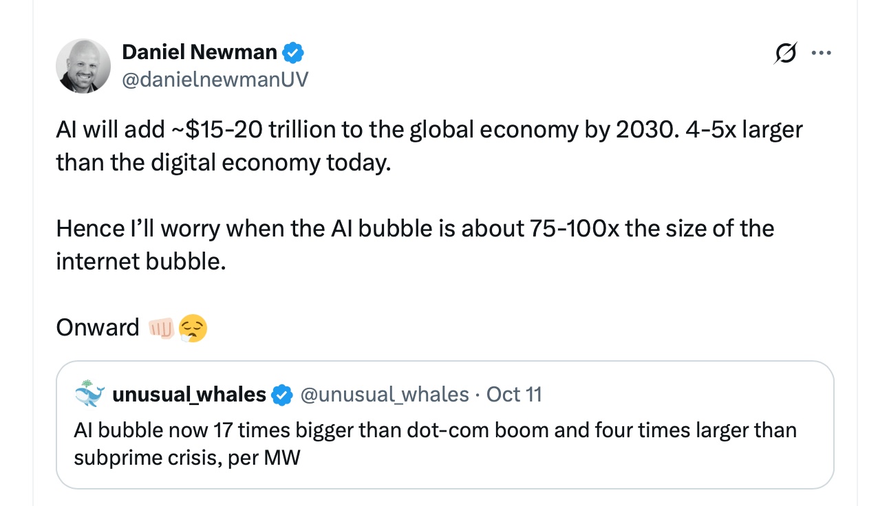 像Daniel Newman这样的乐观者认为没有泡沫,预测到2030年AI可能为全球GDP增加最多20万亿美元。长远承诺与短期投机之间的紧张关系使这一时刻如此不稳定。批评者认为,市场终于在调整现实。由于95%的公司AI项目未能产生回报,公司正在冻结实验预算并缩减基础设施计划。