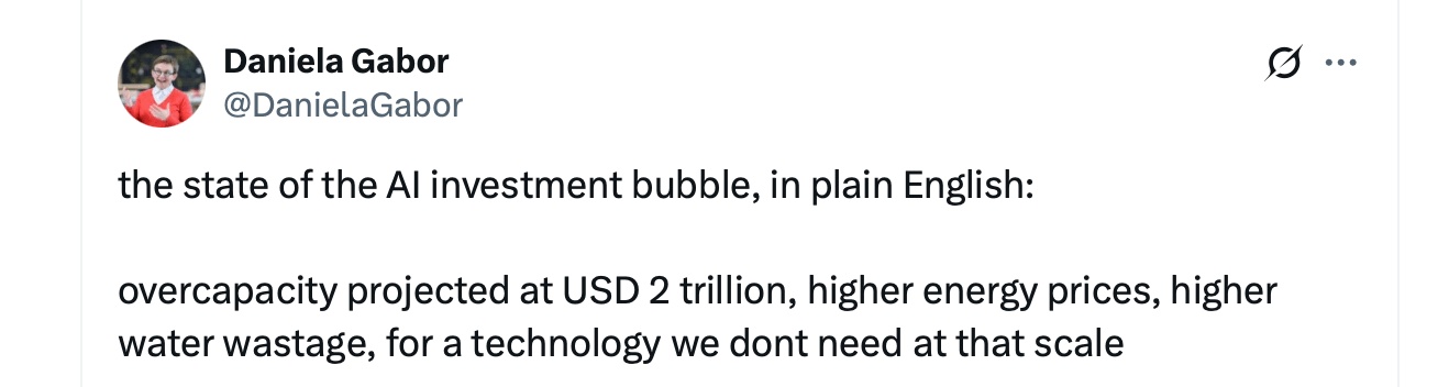 数字令人震惊。分析师估计,AI基础设施的建设已造成近2万亿美元的潜在过剩能力,而数据中心消耗了大量的水和能源。诸如TSMC等芯片代工厂的产能利用率已降至40%以下,而循环投资——比如英伟达资助OpenAI购买AMD芯片——创造了停不下来的增长幻象。