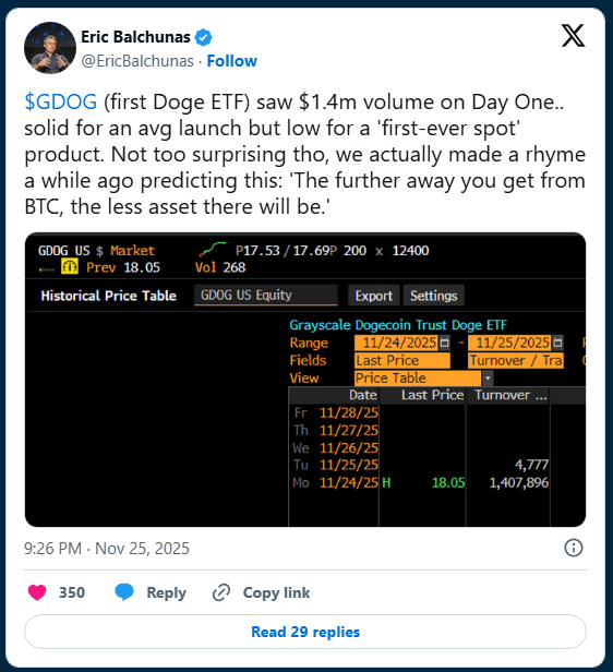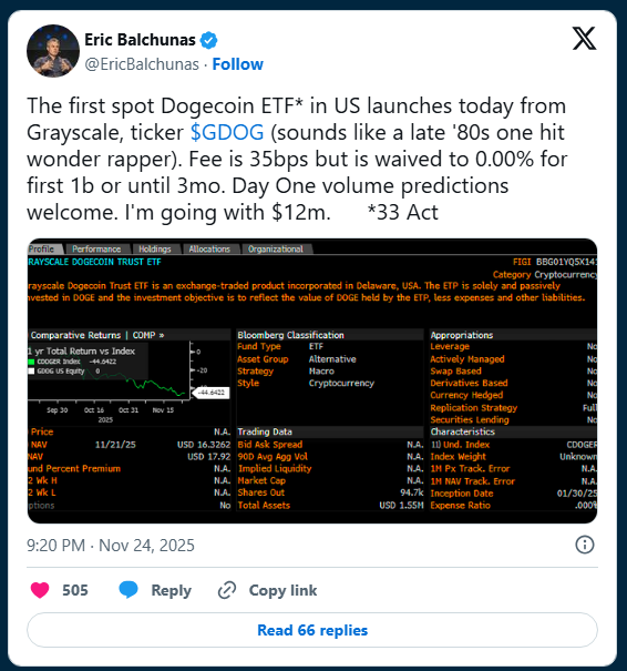 尽管灰度狗狗币信托ETF(代码:$GDOG)是首只现货狗狗币ETF,但其首日交易量仍低于预期。$GDOG于11月24日星期一在纽约证券交易所旗下的NYSE Arca交易所上市,分析师此前预测其首日交易量约为1200万美元。