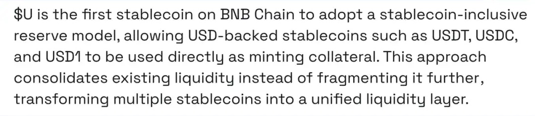 U的设计逻辑与前两者截然不同:它不直接与USDT,USDC或USD1竞争,而是将它们都纳入自己的储备金池。某种意义上,U是「稳定币的稳定币」,或者说「稳定币ETF」。
